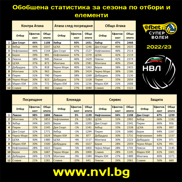 Сезон 2022/2023 в Ефбет Супер Волей ще бъде запомнен не само като един от най-атрактивните и най-емоционалните в последните години, но и като сезона, в който отборите от мъжкия ни елит показаха завидни качества в различните волейболни елементи. За радост на волейболния фен това се отрази на качеството на самите мачове, а интригата беше пълна до последно.
