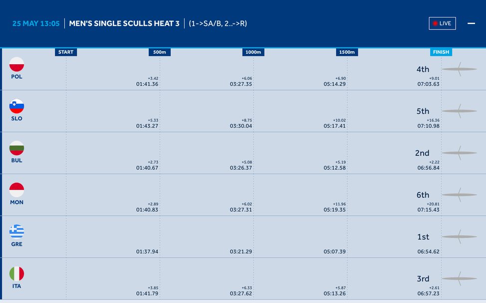 Първото място зае олимпийският шампион от Токио 2020 Стефанос Дускос от Гърция с време 6:54.62 минути и се класира директно за участие на полуфинал.