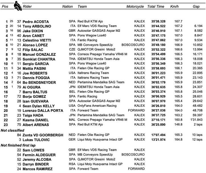 Това наказание на Лопес буквално освободи Акоста да кара по-спокойно и испанецът се възползва максимално от това. Той бързо влезе в ритъм и започна лека по лека да се откъсва от колоната. На финала Акоста спечели с аванс от 6.194 секунди пред Тони Арболино, който също направи много силно състезание, в което стартира едва 10-ти.