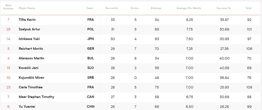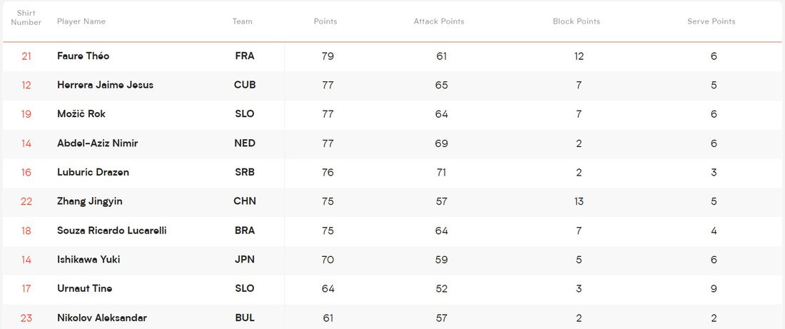 Алекс Николов е 10-и и при топреализаторите с 61 точки (2 блока и 2 аса). Там начело е французинът Тео Форе със 79 точки (12 блока и 6 аса) следван от кубинеца Хайме Хесус Ерера (7 блока и 5 блока) и словенеца Рок Можич (7 блока и 6 блока) с по 77 точки.
