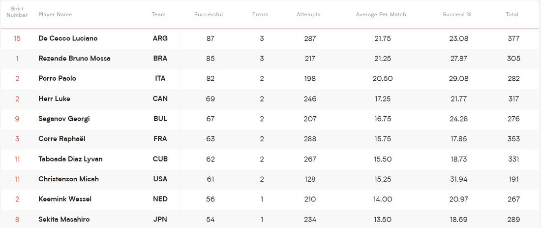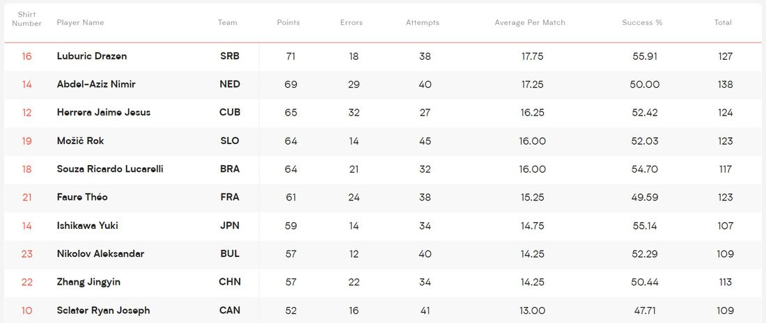 В класацията на нападателите Александър Николов е 8-и с 57 точки от атака, успеваемост от 52,29% и средно 14,25 успешни атаки на мач. Лидер е сърбинът Дражен Лубурич със 71 точки, 55,91% успеваемост и средно 17,75 атаки на мач следван от Нимир Абдел-Азиз (Нидерландия) с 69 точки, 50% успеваемост и средно 17,25 атаки на мач.