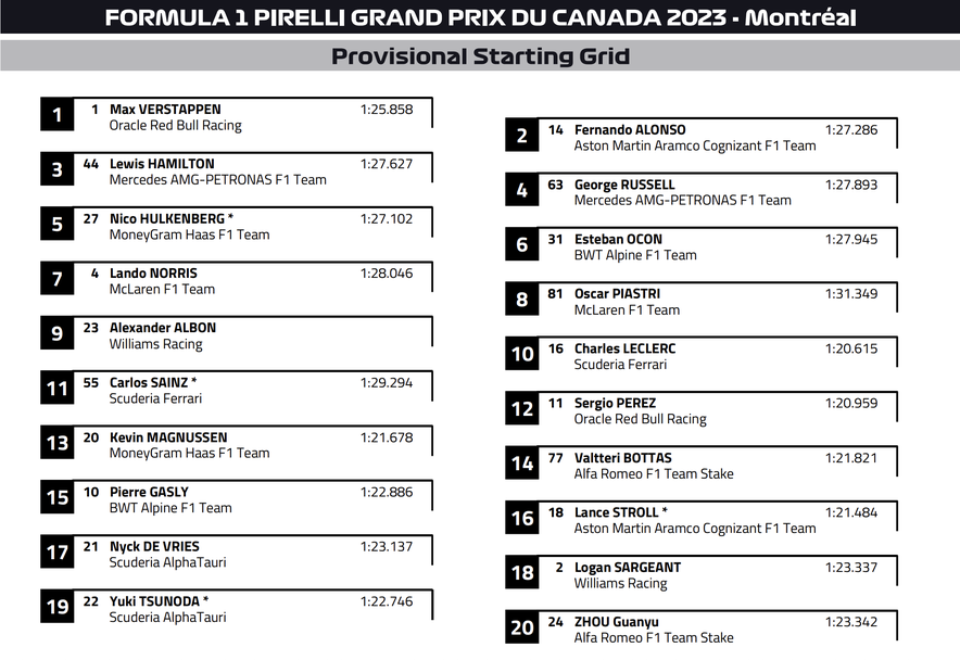 След санкцията на испанеца девети и десети ще потеглят Алекс Албон и съотборникът на Сайнц във Ферари Шарл Леклер, който отпадна още във втората фаза на квалификацията вчера. До Сайнц на шестата редица ще застане Серхио Перес, който също като Леклер отпадна във втората част на сесията за място. За мексиканеца това бе трета поредна разочароващ квалификация след тези в Монако и Испания, в които той отново остана във втората половина на класирането.