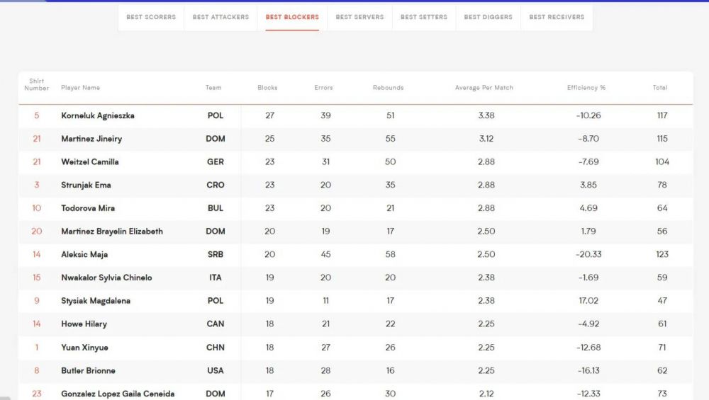 Подреждането се оглавява от полската националка Агниешка Корнелук с 27 блока, средно 3,38 на двубой. Втора и трета са съответно представителката на Доминикана Хинейри Мартинес и германката Камила Вайцел - съответно с 25 и 23 блокади - средно 3,12 и 2,88. В Топ 4 е и хърватката Ема Струняк - също с 23 блокади и средно 2,88, колкото имат и Мира Тодорова и Камила Вайцел.