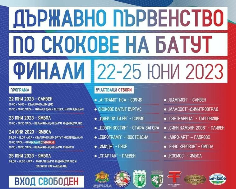 В Сливен от 10:00 часа на 22 юни ще се проведат скоковете на двоен минибатут и акробатична пътека. В 19:00 часа се очаква да бъдат наградени и победителите в двете категории.