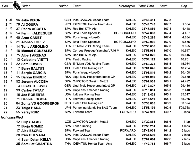 Този спад в темпото на Лопес позволи на Диксън, Ай Огура и Педро Акоста да го изпреварят само в хода на 13-я тур на състезанието. Още в 15-та обиколка обаче Диксън обърка спирането за петия завой, което позволи на Огура и Акоста да минат пред него, преди Акоста да допусне неточност в шикана в края на обиколката.