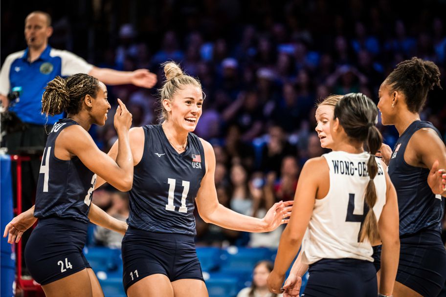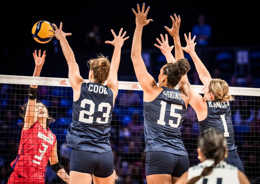 САЩ: Миша Хенкок 4, Андреа Дрюс 13, Келси Робинсън 11, Хийла Ланиер 9, Чаика Огбогу 9, Хийла Уоошингтън 7 - Джъстин Уонг-Орантес-либеро (Джордан Томпсън 2, Александра Франти 3, Дейна Ретке 5, Ейвъри Скинър 11)