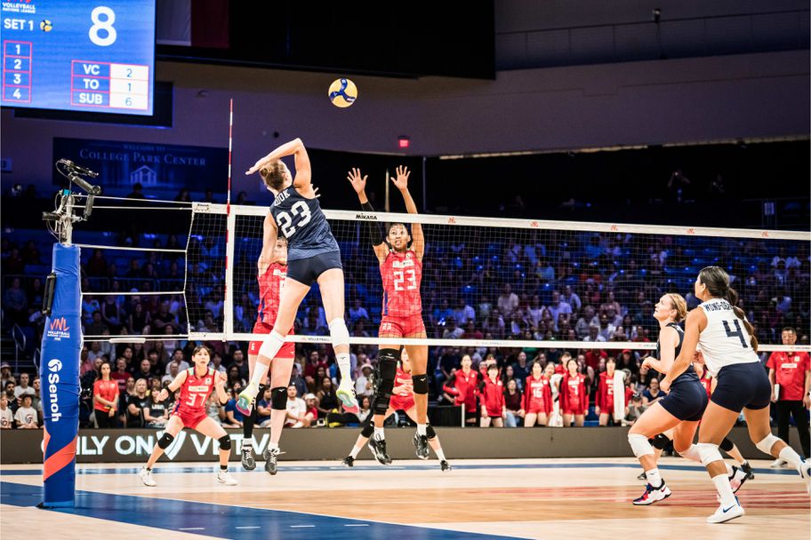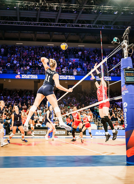 Олимпийските шампионки от Токио 2020 от САЩ сразиха Япония с 3:1 (25:23, 25:21, 18:25, 25:18) във втората на 1/4-финална среща във волейболната лига на нациите за жени в Арлингтън (САЩ).