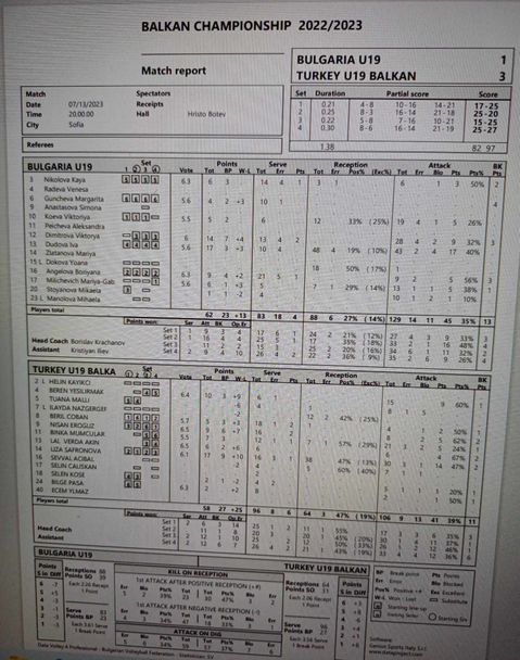 България не успя да се класира на финал на Балканското първенство за жени под 19 години, на което сме домакин. Пред горещата подкрепа от трибуните в столичната зала „Христо Ботев" момичетата на Борислав Крачанов отстъпиха с 1:3 (17:25, 25:20, 15:25, 25:27) пред Турция.