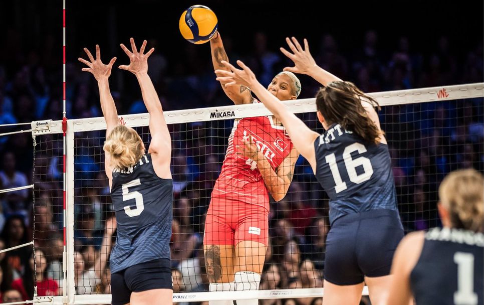 Женският национален отбор на Турция малко изненадващо се класира за големия финал на тазгодишната Волейболна Лига на нациите. Воденият от Даниеле Сантарели тим шокиращо удари домакините - олимпийските шампионки от САЩ, с 3:1 (25:21, 25:14, 24:26, 27:25) във втора полуфинална среща от финалния турнир, играна тази нощ в препълнената зала "Колидж Парк Арена" в Арлингтън (САЩ).