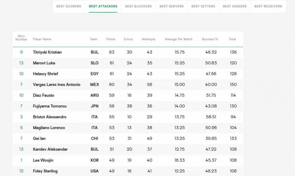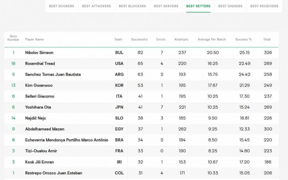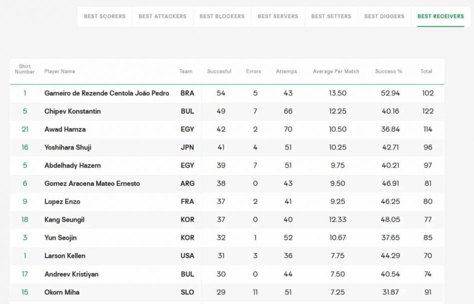 При най-добрите посрещачи друг от националите ни - Константин Чипев е втори, с ефективност 40,16%. Класацията оглавява Жоао Педро Гамейро (Бразилия) - ефективност 52,94%.