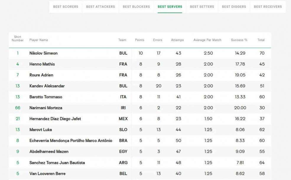 Симеон Николов е първенец и при изпълнителите на сервис - с 10 реализирани аса (средно 2,50 на мач). След него са французите Матис Ено и Адриен Руре - с по 8 аса (средно 2 на мач).