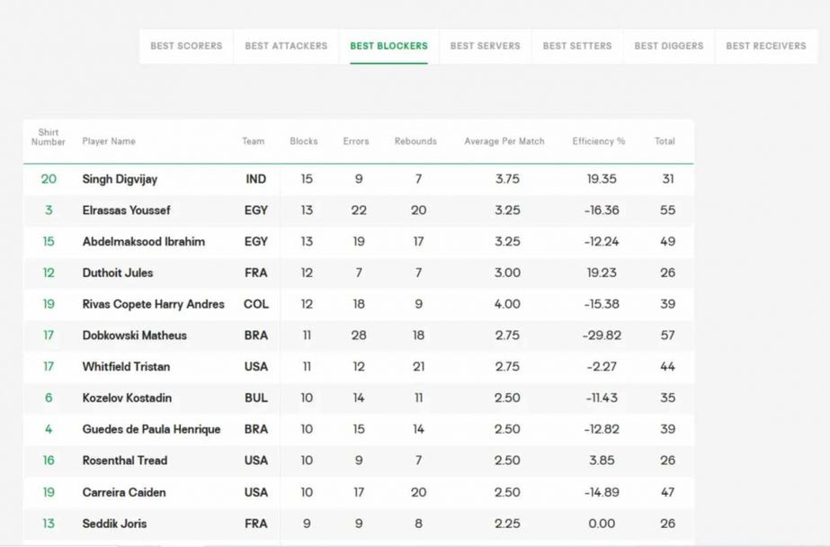 При блокировачите Костадин Козелов е осми с 10 реализирани блока. Лидер е Дигвиджай Сингх (Индия) - с 15 блокади, следван от Юсеф Елрасас (Египет) - с 13 точки от елемента.
