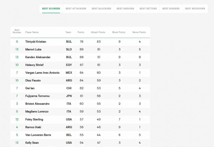 Кристиан Титрийски пък е №1 при нападателите - с 63 точки от атака (средно 15.75 на среща). Топ 3 завършват словенският национал Лука Маровт и египтянинът Шриф Хелауи - с по 61 пункта от нападение.