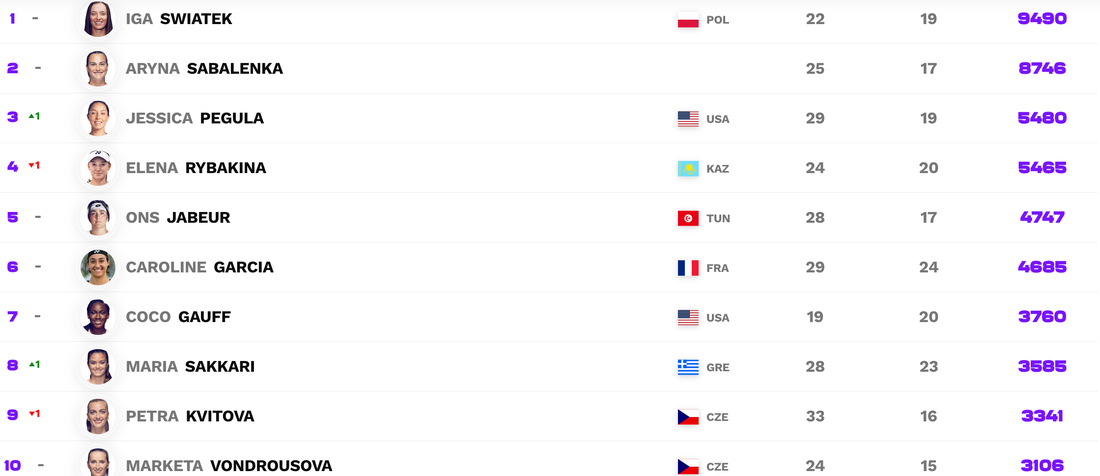 Полякинята Ига Швьонтек остава номер 1 с 9490 точки, следвана от Арина Сабаленка (Беларус) с 8746 точки, а на трето място с изкачва Джесика Пегула (САЩ) с 5480 точки.