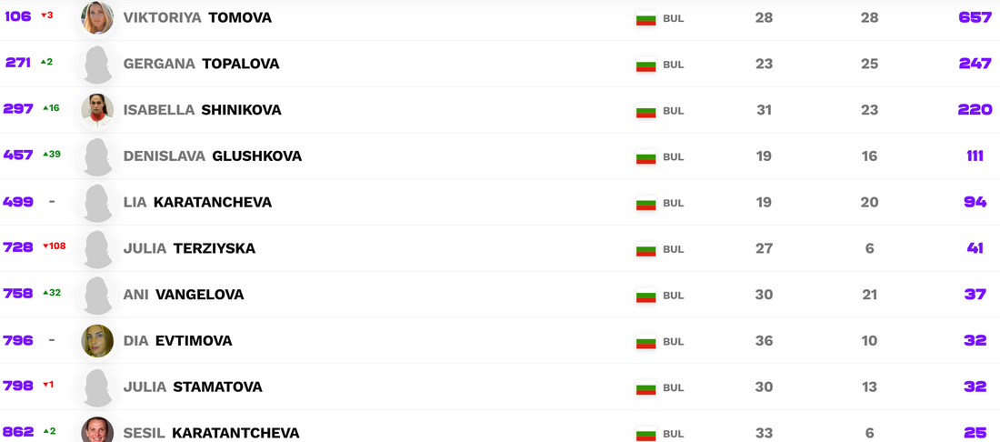 Четвъртата ракета на страната Денислава Глушкова пък бележи рекорден прогрес. Тя се изкачва с 39 позиции до 457-ата в подреждането със 111 точки.