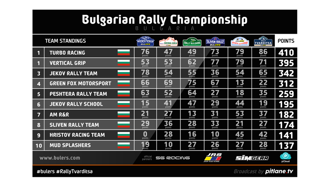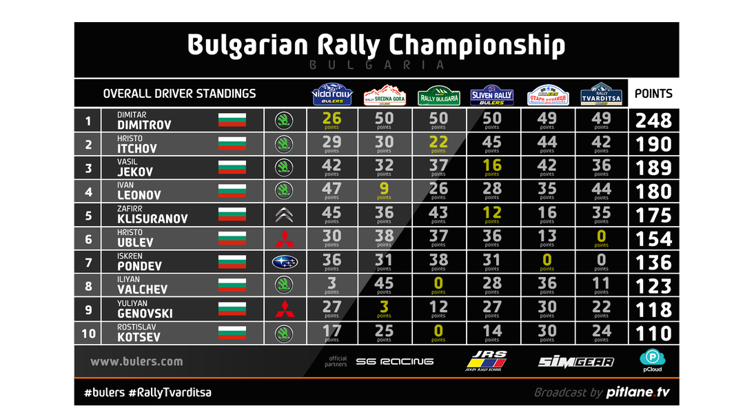 В генералното класиране при пилотите Димитър Димитров завърши първи с 248 точки, втори е Христо Ичов със 190, а трети Васил Жеков със 189. В класирането за R4 автомобили шампион е Христо Ублев със 154 точки, пред съотборника си Искрен Пондев със 136 и Юлиян Геновски със 121. В шампионата при отборите Turbo Racing успяха да завършат първи с 410 точки, пред Vertical Grip с 395 и Jekov Rally Team с 342.