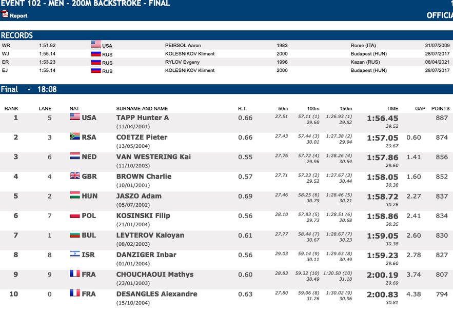 Шампион в дисциплината стана американецът Хънтър Тап, който завърши с 1:56.45 минута. Среброто остана за южноафриканецът Питър Кьоце, който изостана с 60 стотни, а бронзовия медал спечели Кай ван Вестеринг от Нидерландия, който завърши с 1.41 секунди зад победителя.