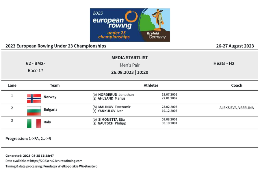 Станислав Григоров и Иван Йорданов финишираха 4-и в първа предварителна серия в дисциплината двойка скул лека категория при младежите.
