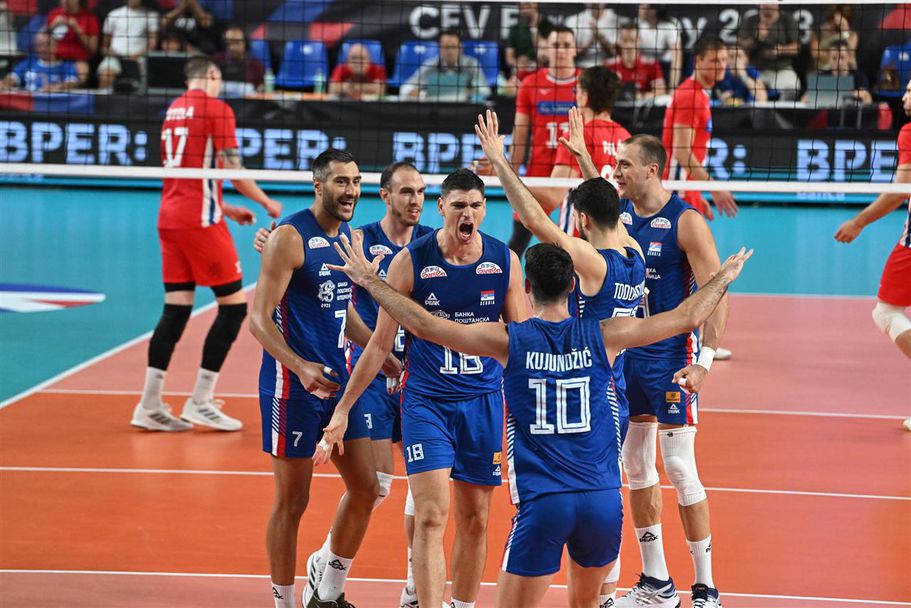 Трикратните шампиони на Европа по волейбол от Сърбия се класираха на 1/4-финал на Европейско първенство. Воденият от Игор Колакович тим надигра Чехия с 3:0 (25:21, 26:24, 25:21) в 1/8.финален двубой, изигран пред 3215 зрители в "Палафлорио" в Бари (Италия).