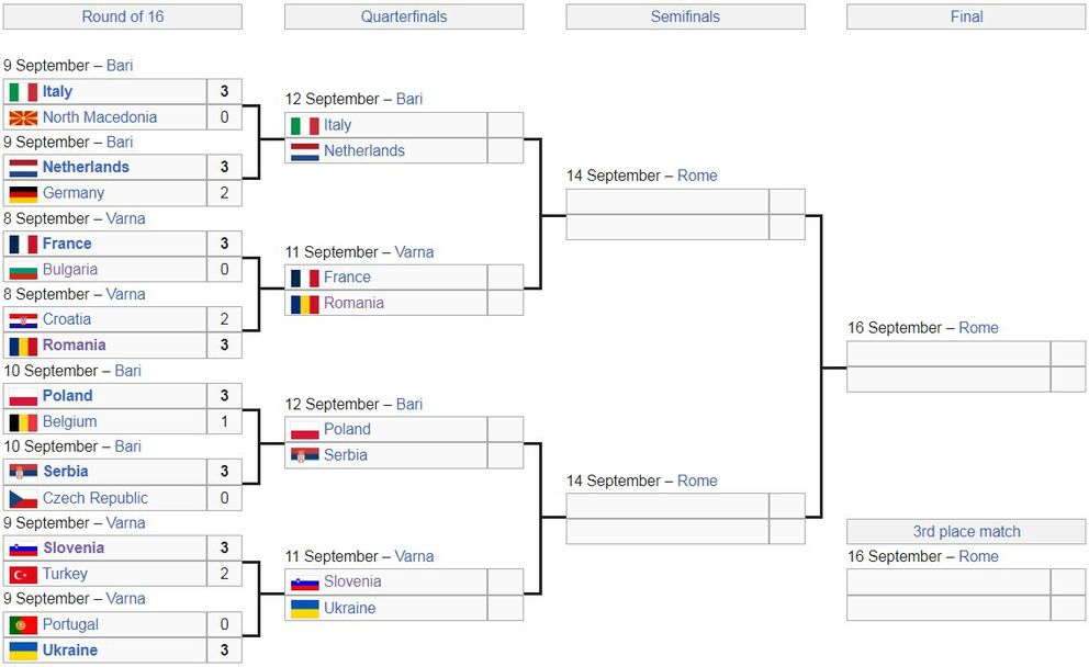 След изиграването на всички осминафинални двубои от Европейското първенство по волейбол при мъжете, станаха ясни всички 1/4-финални двойки в надпреварата.