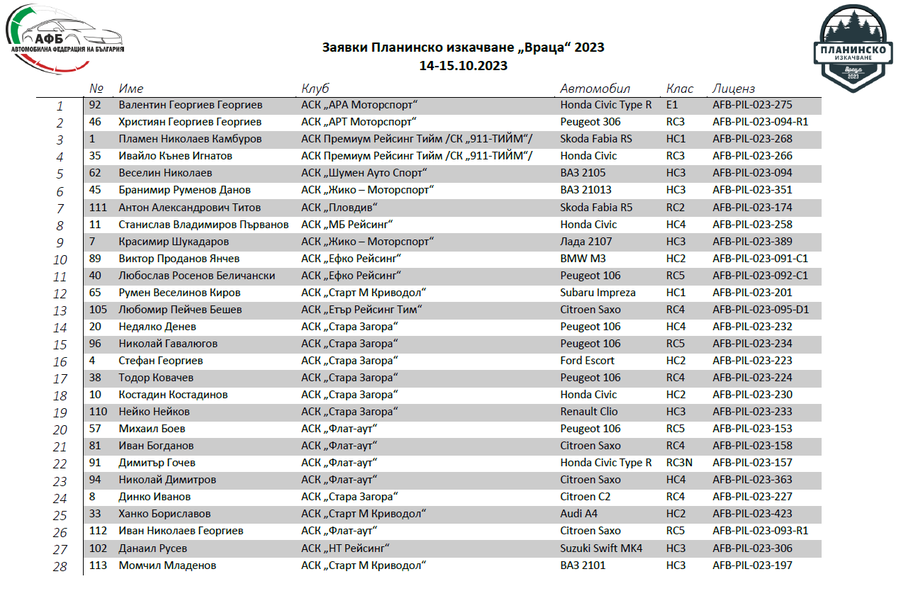 Общо 28 са заявените участници за четвъртия кръг от националния автомобилен шампионат по планинско изкачване "Планинско Враца" (14-15 октомври). Надпреварата ще бъде проведена на живописния път, водещ до пещера "Леденика".