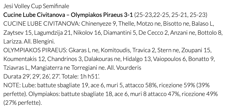 Лубе победи шампиона на Гърция и на “Чалъндж къп” за 2023 година Олимпиакос (Пирея) с 3:1 (25:23, 22:25, 25:21, 25:23) в първата полуфинална среща на приятелския турнир Jesi Volley Cup.