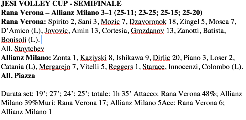 Верона, който е воден от Радостин Стойчев, срази Алианц (Милано) с 3:1 (25:11, 23:25, 25:15, 25:20) във втората полуфинална среща на приятелския турнир Jesi Volley Cup.