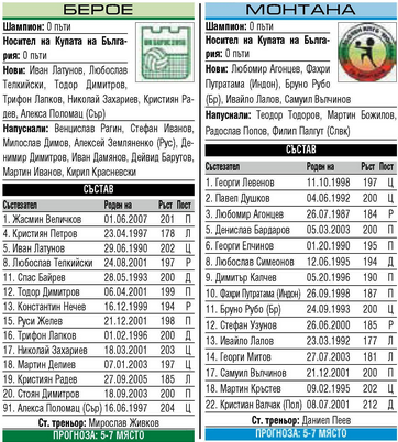 С важна роля ще бъде и Монтана. Даниел Пеев имаше проблеми с контузии през миналата година, които оставиха тима извън битката за титлата въпреки страхотния есенен полусезон. Екзотиката в Монтана е гарантирана от индонезиеца Фахри Путратама, полския диагонал Кристиан Валчак и бразилския център Бруно Рубо. Самуил Вълчинов също премина в отбора през лятото. Предвид умението на Пеев да сглобява боеспособни състави, мястото на Монтана в Топ 6 изглежда гарантирано.
