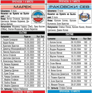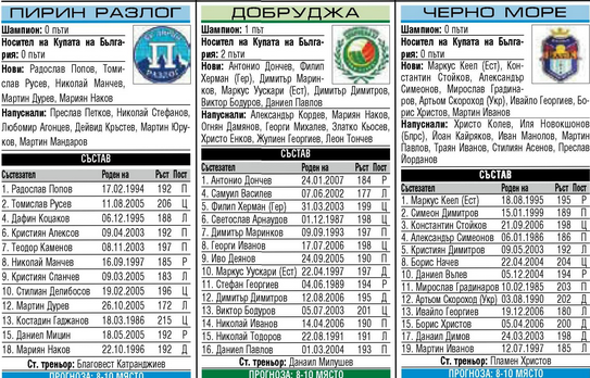 Пирин едва ли ще бъде застрашен от изпадане, но за поредна година няма да е страшилището, което мнозина си спомнят в последните 15 години. Добрата новина в Разлог е завръщането на Радослав Попов. Марек запази състава от миналата година и вероятно няма да има проблем с оцеляването в елита. Едва ли обаче дупничани ще могат да се надяват на нещо повече. Като сигурен изпадащ се откроява новакът Раковски. Отборът от Севлиево влезе в Суперлигата, но селекцията му трудно ще може да избегне връщането във Висшата лига.