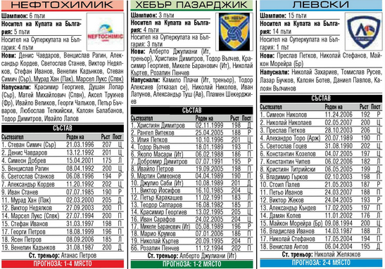 в шампионата се очертава за втори пореден сезон да бъде Берое. Мирослав Живков изгради отново симпатичен отбор, след като привлече шампионите с Нефтохимик Любослав Телкийски и Тодор Димитров, както и Трифон Лапков и Иван Латунов от Хебър. Талантът в Стара Загора, съчетан с работата на Живков гарантират много трудни мачове за всеки един от фаворитите срещу старозагорци. С по-високи амбиции тази година ще бъде и осмият от редовния сезон през миналата година Черно море. Пламен Христов получи естонския национален разпределител Маркус Кеел и украинеца Артьом Скороход, които заедно с Александър Симеонов ще добавят качество.