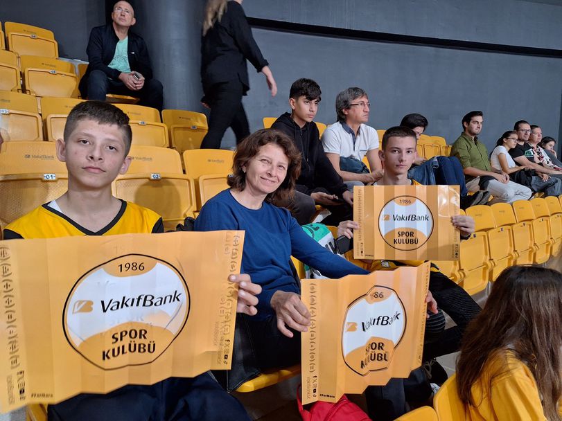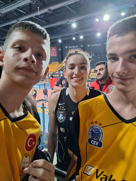 Но най-трудното предстоеше. Не знаем със кой автобус трябва до стигнем до залата.Тогава случайно видяхме две момичета с фланелки на Вакъфбанк , които ни казаха ,че това е автобус №11 C. В Истанбул е нещо невероятно. На всяка минута идват автобуси и микробуси с различни номера. Стигнахме до величествената зала и влязохме в ресторанта на самата зала. Оказа се, че тя е само за служители и и волейболисти на Вакъфбанк. Тогава управителят дойде при нас и ни попита какво търсим тук. Когато му казахме, че сме от България и идваме да гледаме волейболната среща като големи фенове на турския отбор, той се зарадва. Показахме му снимки на момчетата със двата отбора, а той се изуми и каза, че в Турция дори е най-запалените фенове няма толкова много снимки. Представи ни на журналистите и волейболистките. Такова гостоприемство не очаквахме. Почерпи ни със баклава, кадаиф и турски чай. И в този момент момчетата ми се срещнаха с детската си мечта - Габи Гимараеш. Направихме и подарък - снимки със изображения от различни места във България и магнитни сувенири за целия отбор. Габи Гимараеш каза, че по големи нейни фенове и на волейбола не познава, а целувките бяха доказателство за тези нейни думи…”