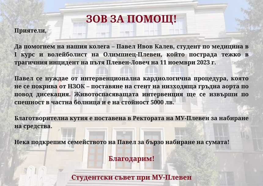 Калев, който е студент от първи курс в Медицински университет Плевен, се нуждае от интервенционална кардиологична процедура, която не се покрива от НЗОК - поставяне на стент на низходяща гръдна аорта по повод дисекация. Животоспасяващата интервенция ще се извърши по спешност в частна болница и сумата е на стойност 5000 лева. Като след това му предстои операция на бедрена кост.