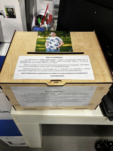 Вече има поставени дарителски кутии за събиране на средства за Павел Калев в магазин "Зора" - Панорама мол, Медицински Университет Плевен, СУ "Иван Вазов", ДКЦ "Авис Медика" ООД - регистратура.
