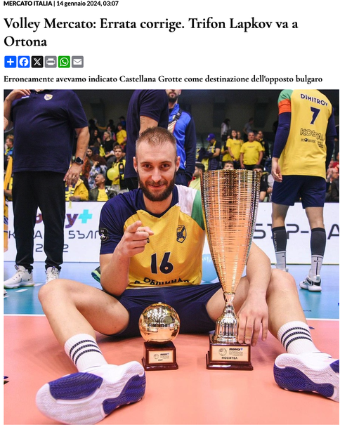 Преди няколко дни Volleyball.it съобщи, че Трифон Лапков ще продължи кариерата си в Кастелана Гроте в Серия А2, но се оказа, че пловдивчанинът ще заиграе в Ортона.