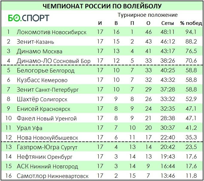 Шампионите от Казан изместиха Динамо от втората позиция във временното класиране, като имат 43 точки (15 победи, 2 загуби). Московчани са трети с 41 точки (13 победи, 4 загуби).