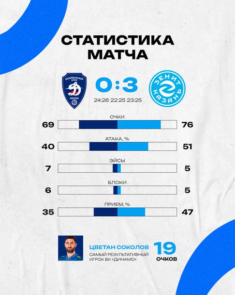 ДИНАМО: Павел Панков 1, ЦВЕТАН СОКОЛОВ 19, Ярослав Подлесних 2, Антон Семишев 6, Дмитрий Жук 7, Иля Власов 9 - Лаури Кераминен-либеро (Чеславс Свентицкис 1, Евгений Баранов-либеро, Кирил Костиленко 3)