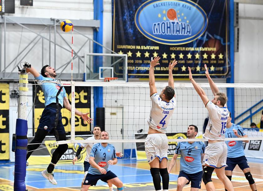 ""Волейболистите на Монтана поведоха с 8:6 в началото на третата част. "Сините" намалиха до 11:12. домакините дръпнаха с 15:12. Възпитаниците на Даниел Пеев поведоха с 19:15. "Сините" намалиха до 18:19. Блокаут на Владимир Гърков и 19:19. Кристиян Валчак изведе Монтана до геймбол при 24:22. Самуил Вълчинов атакува успешно и домакините спечелиха третата част с 25:23.