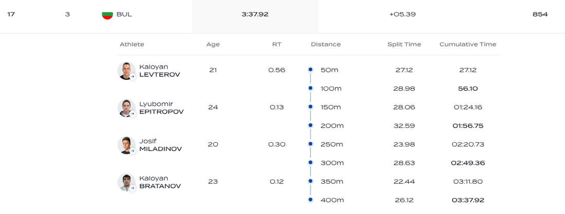Българският квартет финишира втори в първа предварителна серия с време 3:37.92 минути и не успя да слезе под националния рекорд 3:37.48 от Европейското първенство в Будапеща преди 3 години, след като бе изпреварен от състава на Нидерландия с 6.03 секунди.