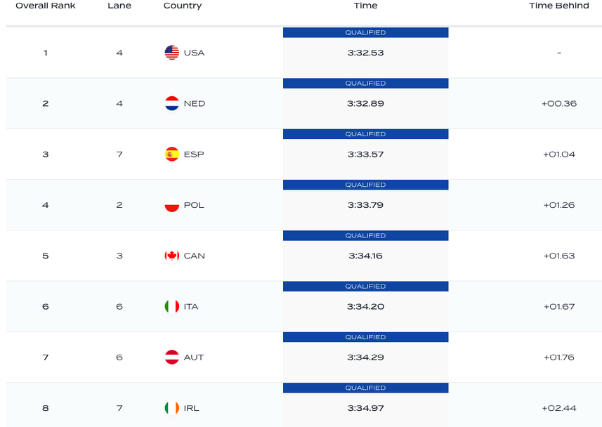Първо време в сериите даде щафетата на САЩ с 3:32.53 минути.