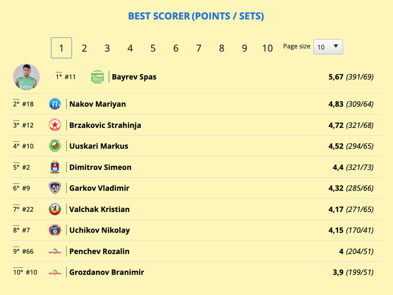 Средно на гейм Байрев е реализирал 5,67 точки. След него в подреждането е Мариян Наков (Пирин (Разлог)) с 4,83 точки на гейм. Страхиня Бързакович пък е трети с 4,72 точки.