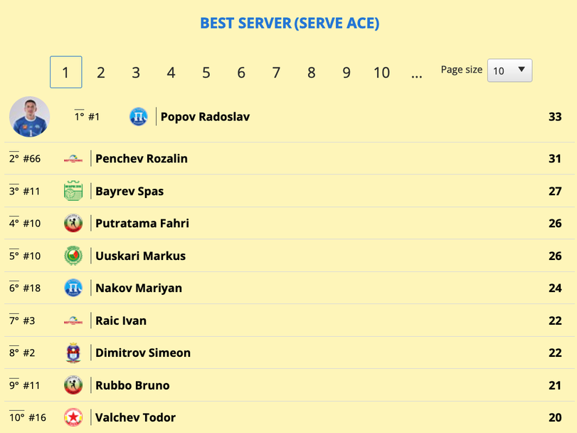 По брой асове начело на класацията Радослав Попов е лидер, с 33 точки, следван от Розалин Пенчев с 31 аса.