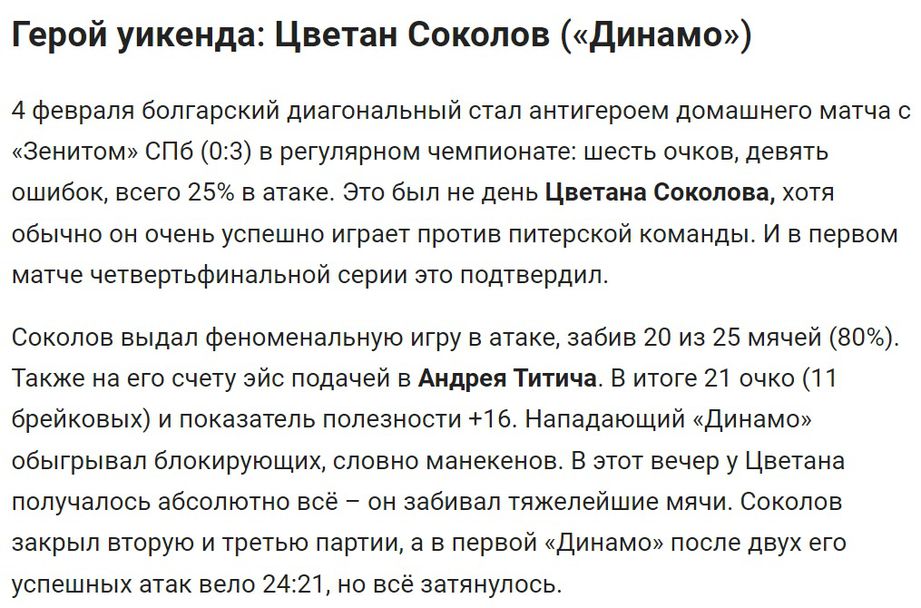 "На 4-и февруари българският диагонал се превърна в антигерой при домакинството на Зенит Санкт Петербург (0:3) от редовния сезон - 6 точки, 9 грешки и само 25% в атака. Не беше денят на Цветан Соколов, въпреки че той обикновено играе много успешно срещу тима от Санкт Петербург. И в първия мач от 1/4-финалната серия това се потвърди.