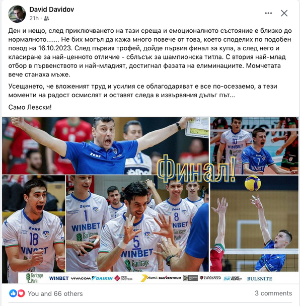 “Ден и нещо, след приключването на тази среща и емоционалното състояние е близко до нормалното....... Не бих могъл да кажа много повече от това, което споделих по подобен повод на 16.10.2023. След първия трофей, дойде първия финал за купа, а след него и класиране за най-ценното отличие - сблъсък за шампионска титла. С втория най-млад отбор в първенството и най-младият, достигнал фазата на елиминациите. Момчетата вече станаха мъже.