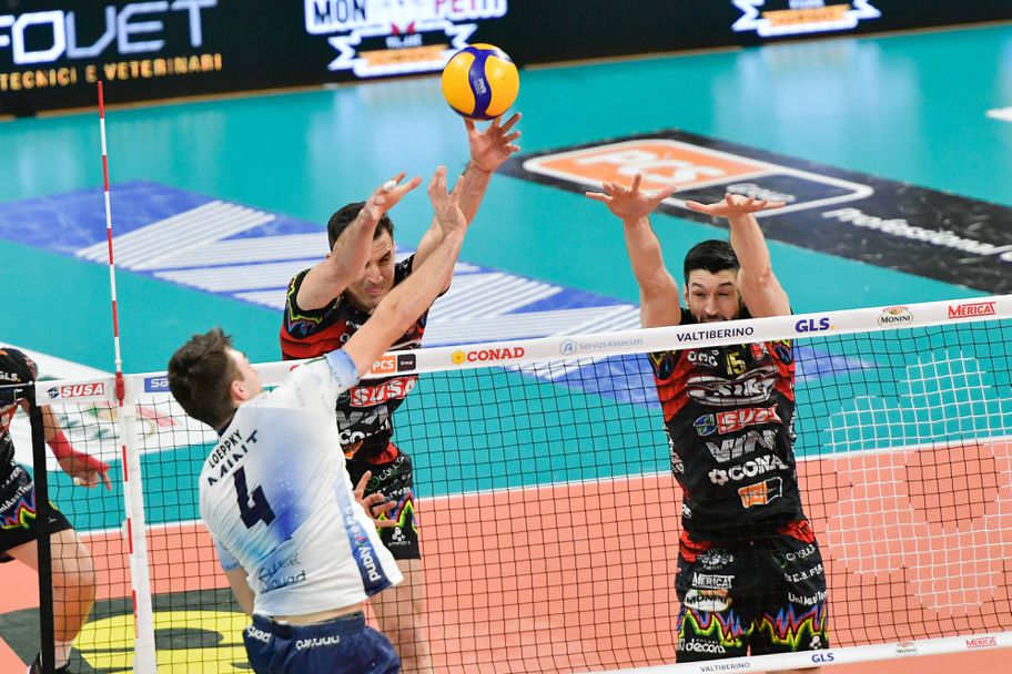 Отборът на Сър Суса Вим (Перуджа) е на победа от спечелване на титлата в Суперлигата на Италия. Играчите на Анджело Лоренцети се наложиха у дома над Минт Веро Волей (Монца) с 3:1 (25:15, 25:18, 24:26, 25:19) в третата среща от финалната серия, играна късно снощи пред над 5200 зрители в зала "Пала Бартон".