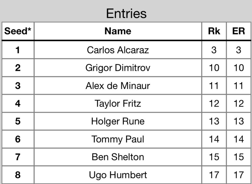 В листата с участниците в тазгодишното издание на престижния турнир личат имената на още осем представители на Топ 20 - Алекс Де Минор (№11), Тейлър Фриц (№12), Холгер Руне (№13), Томи Пол (№14), Бен Шелтън (№15), Уго Юмбер (№17), Карен Хачанов (№18) и Себастиан Баес (№20).