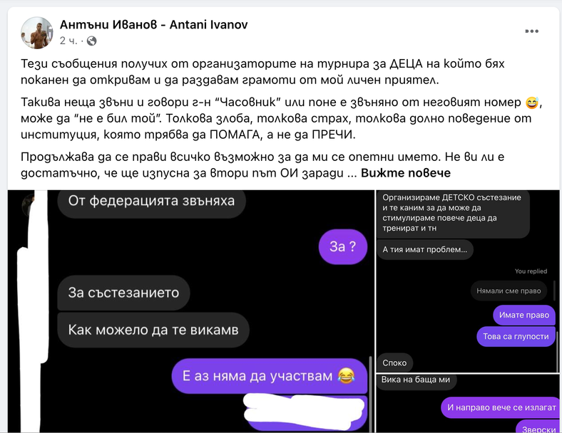 24-годишният търновец, който има шесто място на 200 метра бътерфлай от Световното първенство в Абу Даби 2021, две осми места в същата дисциплина от шампионата на планетата в Будапеща 2017 и на малък басейн в Гуанджоу 2018, както и осмо място с щафетата на 4 по 200 метра свободен стил от Мелбърн 2022, е бил поканен от свой личен приятел да открие турнира и да раздаде грамоти на малките участници. Но какво било изумлението му, когато разбрал, че от федерацията са звъняли на организаторите, за да им кажат, че нямат право да правят това. Плувецът цитира и номера на телефона, от който се е получило обаждането, твърдейки, че той е на президента на БФПС Георги Аврамчев.