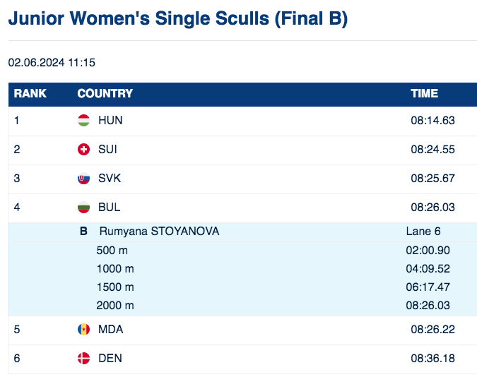 Румяна Стоянова се класира четвърта на скиф при девойките във финал “Б”, след като измина дистанцията от 2000 метра за 8:26.22 минути.