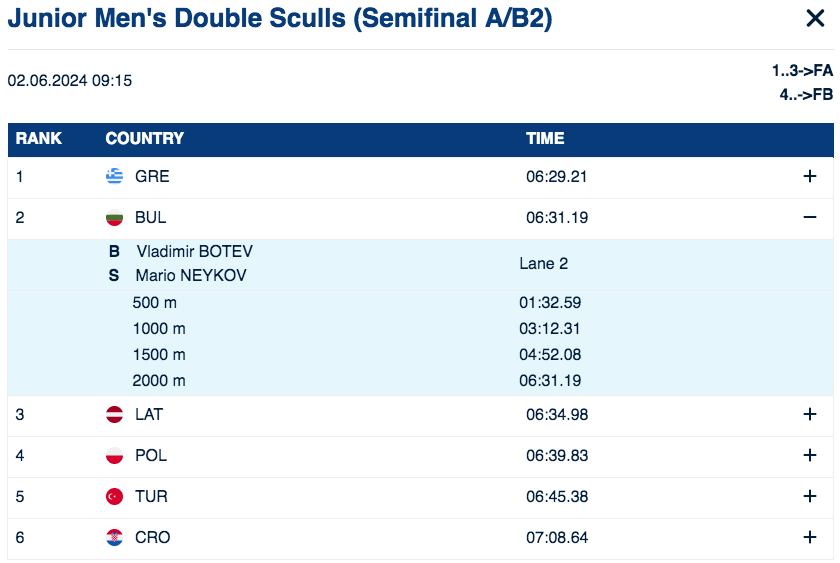 Трета финишира лодката на Латвия (Емилс Никс Доновс, Валтерс Сиянс) с 6:34.98 минути.