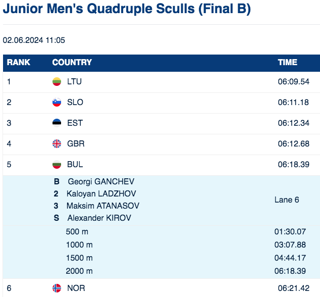 Георги Ганчев, Калоян Лазаров, Максим Атанасов и Александър Киров станаха 5-и във финал “Б” в дисциплината четворка скул за юноши.