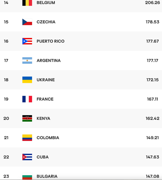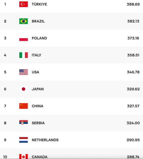 Начело остава миналогодишният шампион в Лигата на нациите Турция с 388.69 точки, пред волейболистките на Бразилия с 382.13 точки и Полша с 373.16 точки.